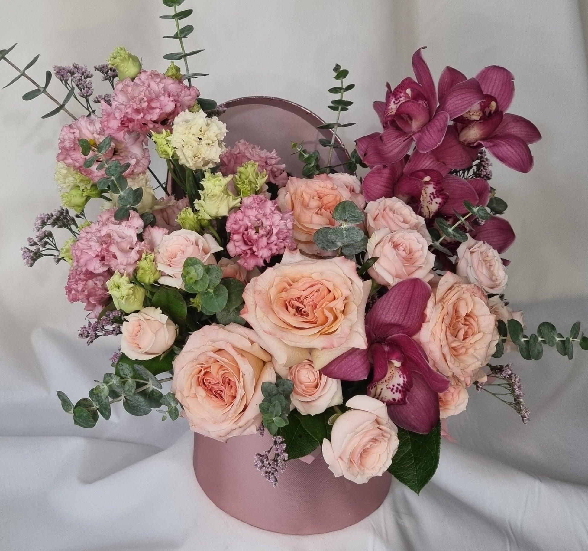 Presented in a stylish matte pink hat box, this design exudes warmth, grace, and sophistication — a perfect choice for birthdays, anniversaries, or heartfelt gestures.