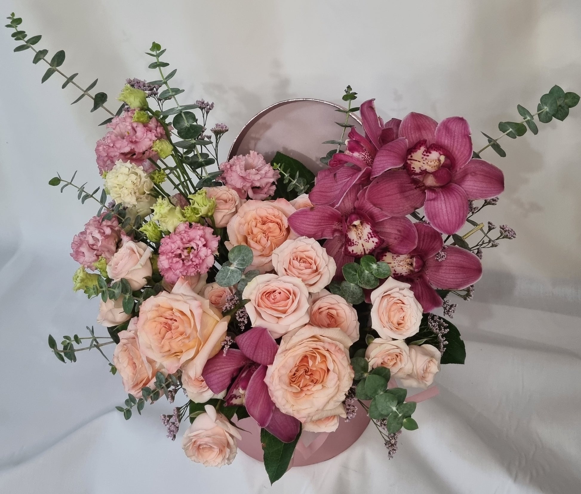 A romantic and elegant arrangement featuring soft blush roses, delicate lisianthus, fragrant stock, and exotic cymbidium orchids.