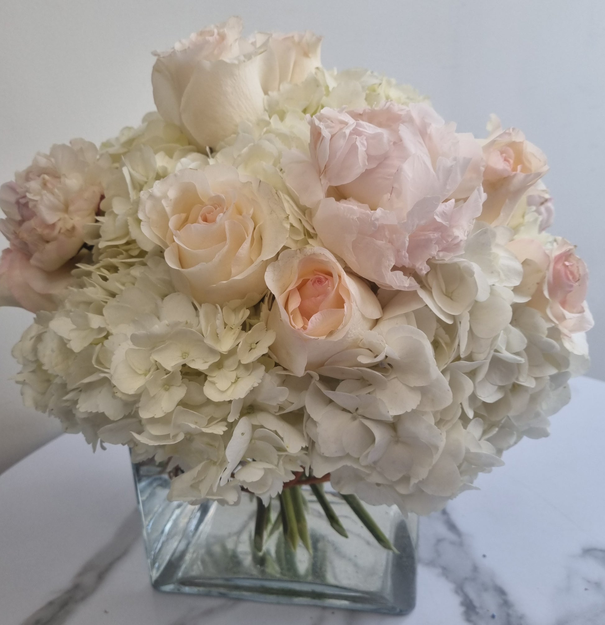 A soft, luxurious composition designed in delicate ivory and blush tones. Voluminous white hydrangeas create a cloud-like base, perfectly complemented by blush garden roses and soft peonies for a touch of romantic elegance. Arranged in a modern glass cube, this piece feels airy, timeless, and effortlessly sophisticated — ideal for weddings, anniversaries, baby showers, or elevating any interior with refined beauty.